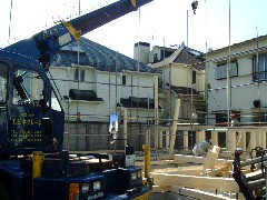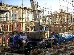 本日は木造建て方です。クレーン側足場は後施工なので起伏角を有効に生かして作業できました。大工さんお疲れ様でした。