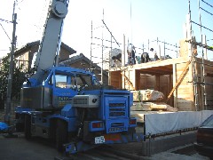 今日は木造建て方作業の現場です。柱、梁、杉の壁板まで化粧で凝った作りのお宅でした。今日は2階の柱までの作業で終了です。大工さん、監督さん、1日お疲れさまでした。