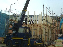 本日は木造建て方作業です。前面道路からの作業で車の通行が出来るようになるべく寄せて作業致しました。上部は電線も無く順調に棟上いたしました。皆様お疲れ様でした。