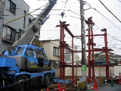 今日は鉄骨建て方作業の現場です。変形の角地で電線電話線が要塞のように土地を守っていました。階段室を後工事にしてスペースを作り建て方作業を行いました。それでも荷取りには神経を使いました。寒い1日で時折小雨が降る天気でしたが、無事に建て方作業は終了しました。鉄骨屋さん、鳶さん、監督さん、警備員さん、1日お疲れさまでした。